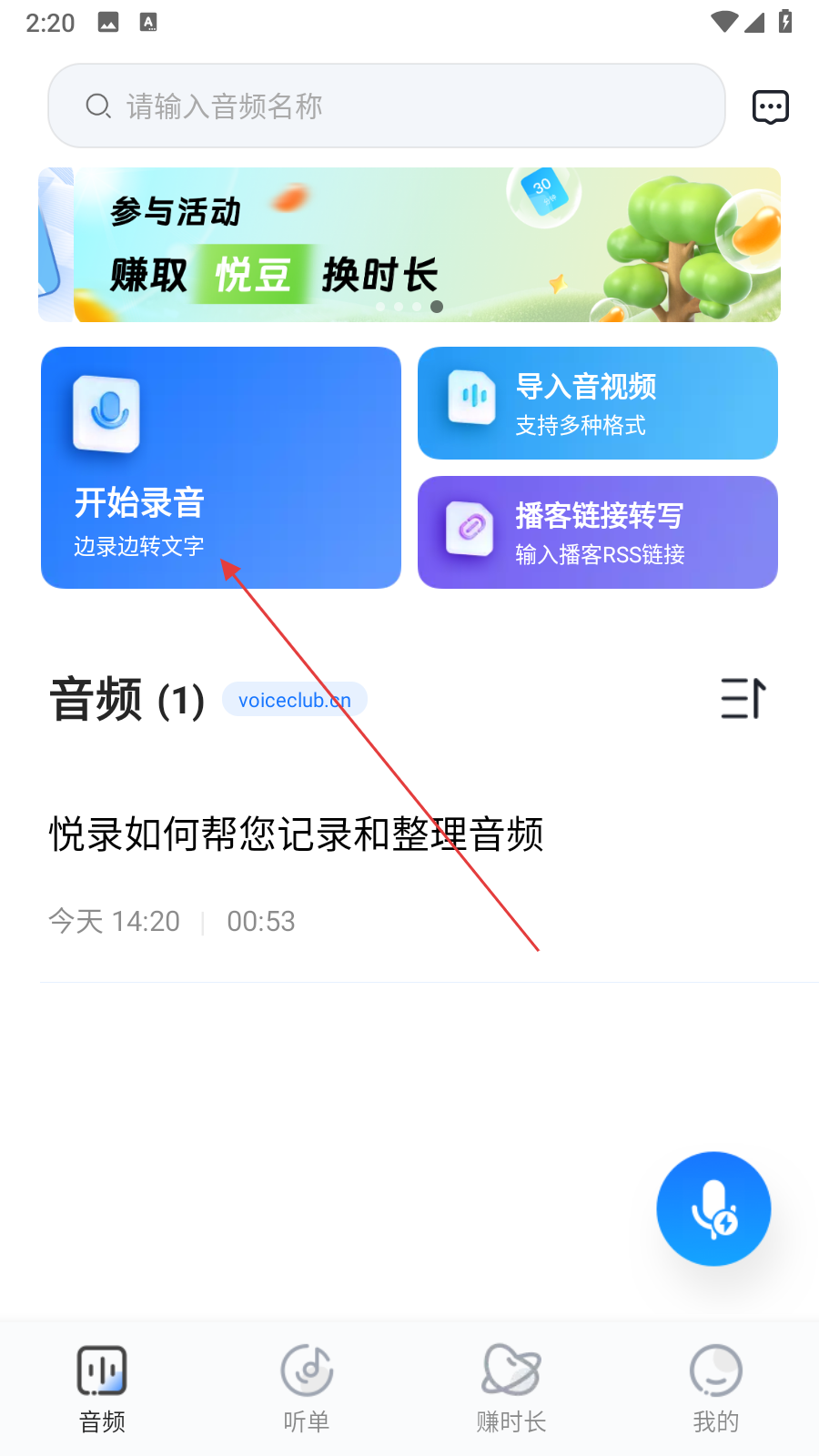 1、打開(kāi)悅錄應(yīng)用,在主界面點(diǎn)擊開(kāi)始錄音按鈕,進(jìn)入錄音頁(yè)面。