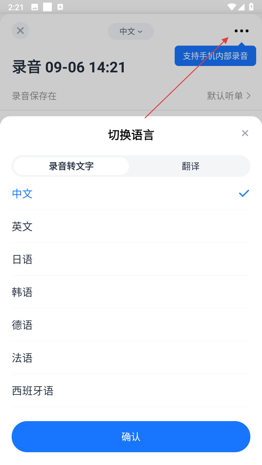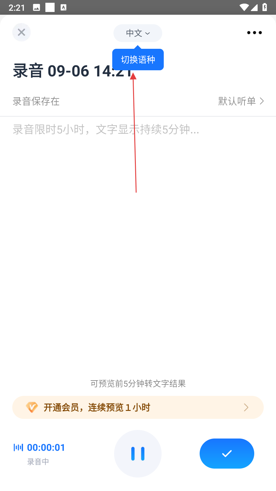 2、在錄音頁(yè)面頂部,點(diǎn)擊切換語(yǔ)種選項(xiàng)。
