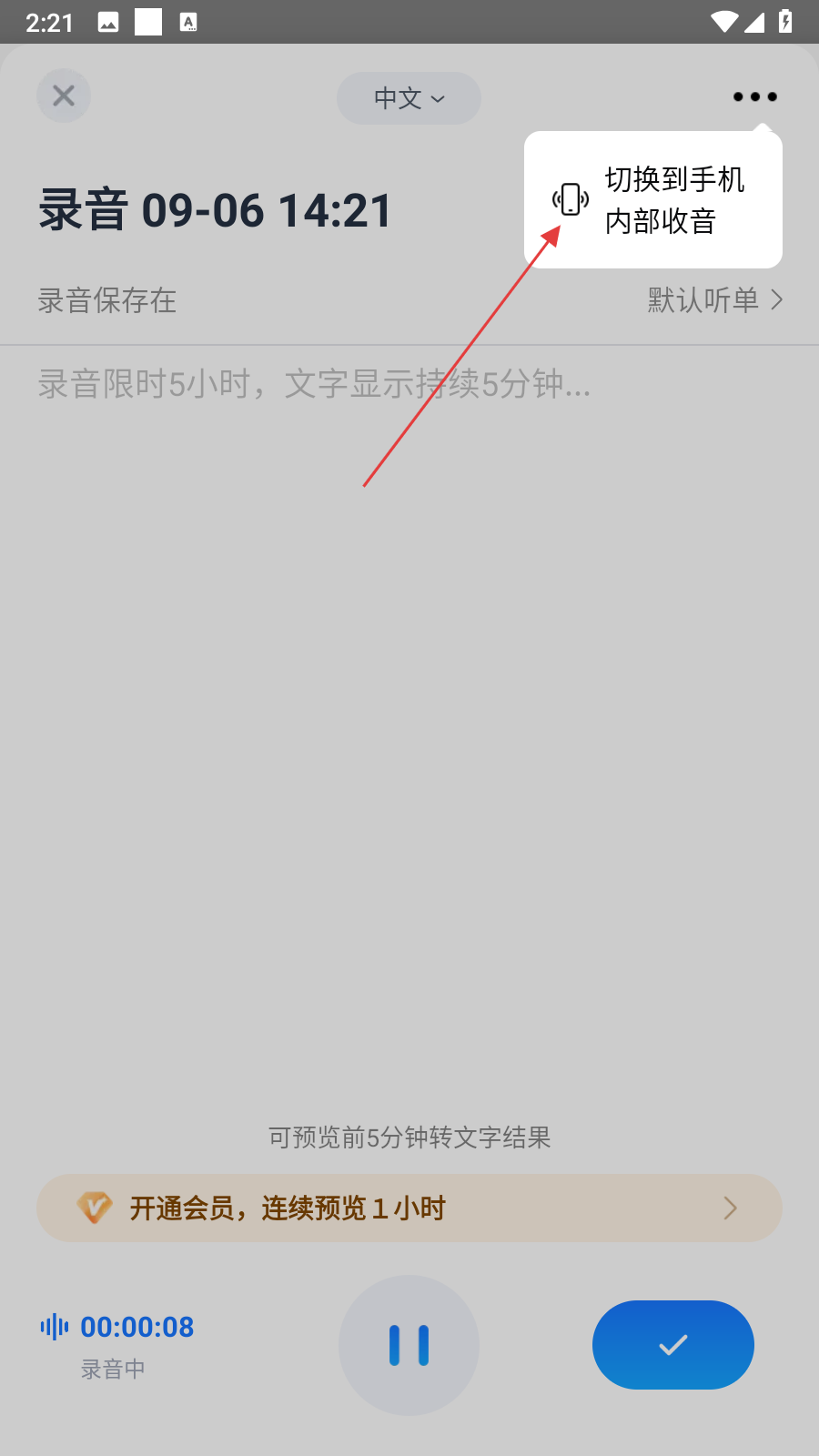 4、點(diǎn)擊錄音頁(yè)面右上角的三點(diǎn)圖標(biāo),切換到手機(jī)內(nèi)部收音模式。