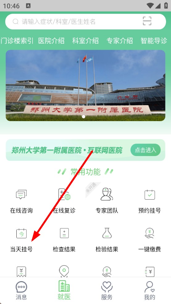 1、打開鄭大一附院掌上醫(yī)院APP,進入「就醫(yī)」模塊,點擊常用功能區(qū)的「當(dāng)天掛號」選項。