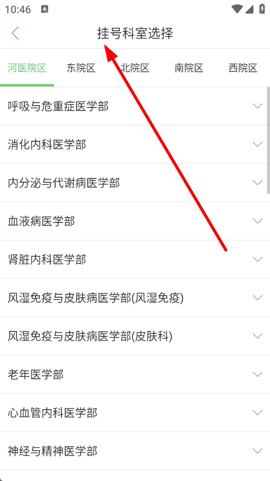 2、進入掛號科室選擇頁面,先選院區(qū),如河醫(yī)院區(qū),再選擇目標(biāo)科室,如呼吸內(nèi)科。
