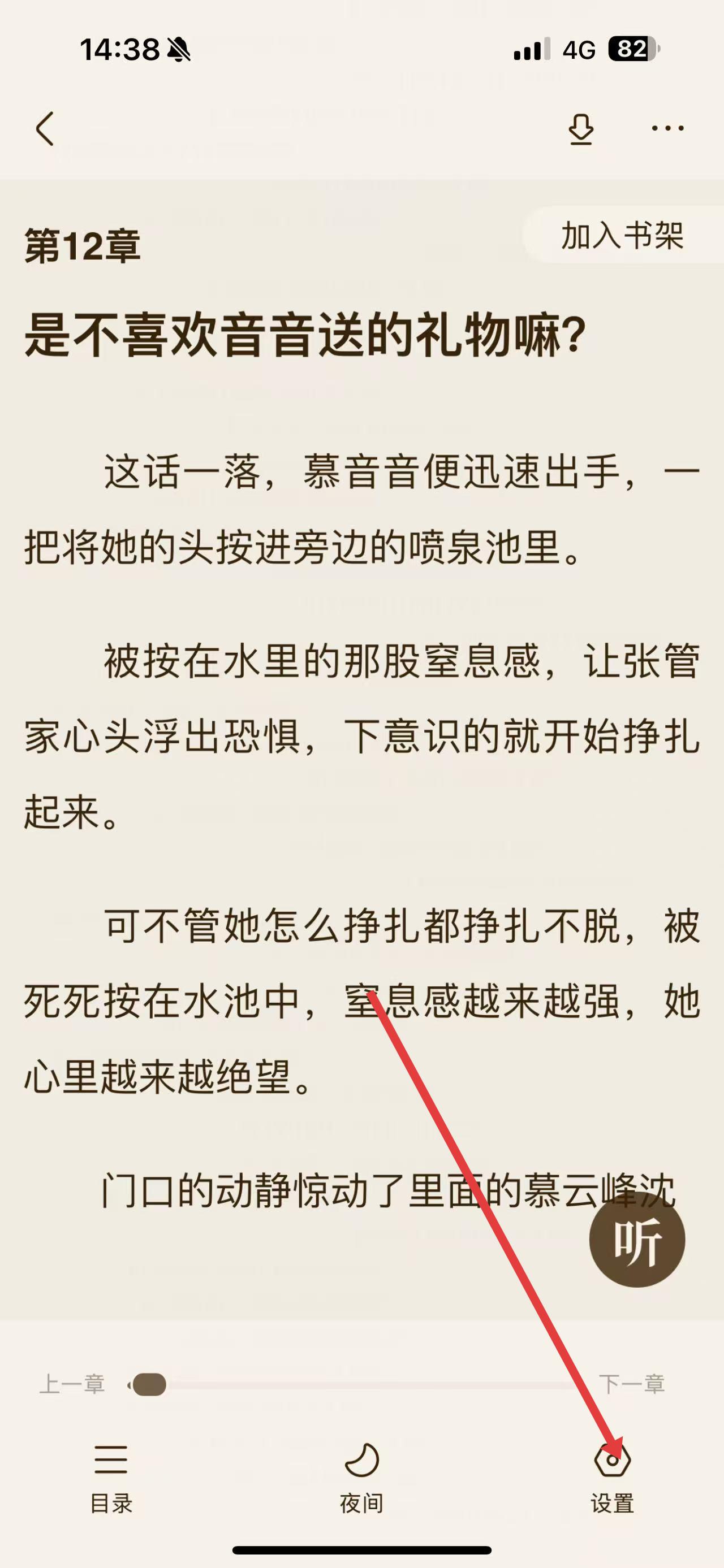 2、在小說(shuō)閱讀頁(yè)面,點(diǎn)擊下方設(shè)置圖標(biāo),進(jìn)入設(shè)置界面。