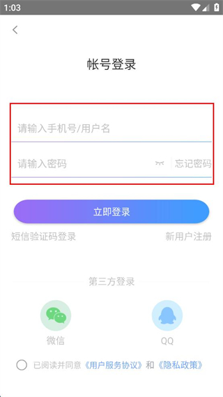 3、在賬號(hào)登錄頁面,依次填寫手機(jī)號(hào)/用戶名和對(duì)應(yīng)的密碼,準(zhǔn)備進(jìn)行登錄操作。