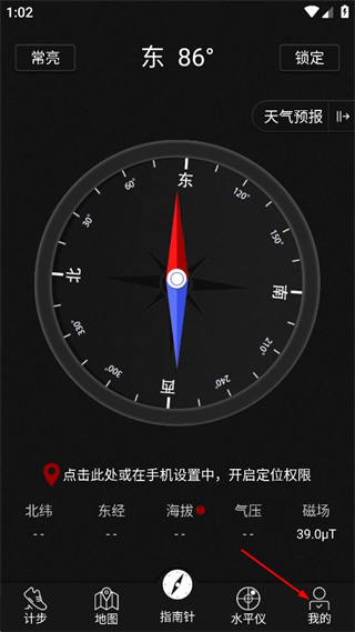 1、打開指南針應(yīng)用主界面,查看指南針指向及相關(guān)信息,點(diǎn)擊底部導(dǎo)航欄的我的選項(xiàng)。