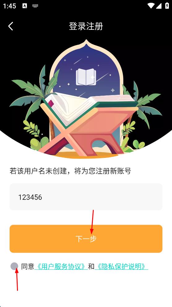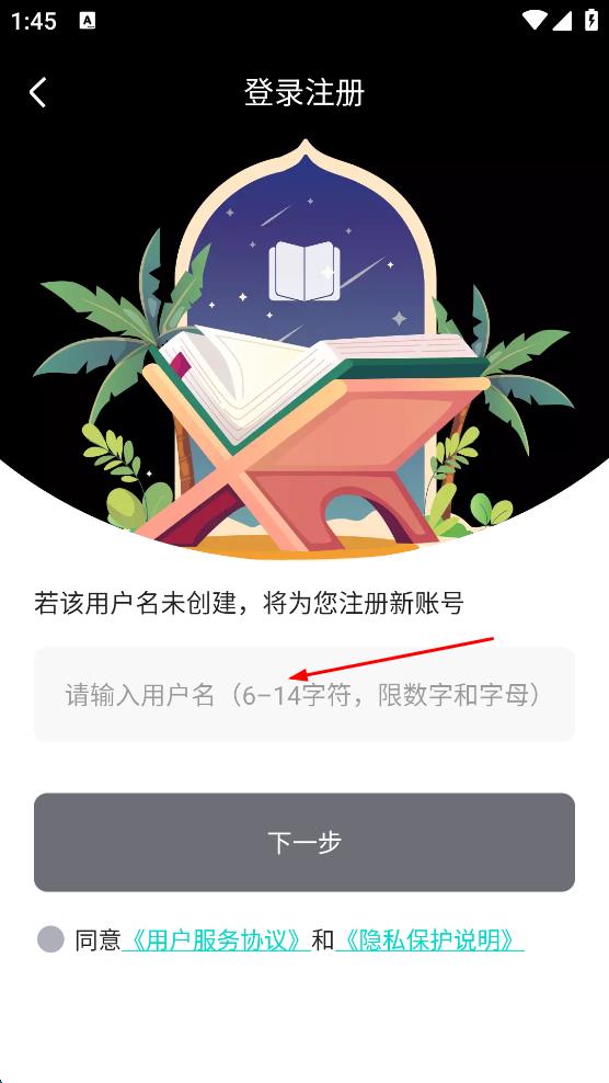 4、用戶(hù)名輸入完成后,勾選“同意用戶(hù)服務(wù)協(xié)議和隱私保護(hù)說(shuō)明,然后點(diǎn)擊“下一步”,進(jìn)行后續(xù)登錄注冊(cè)流程。