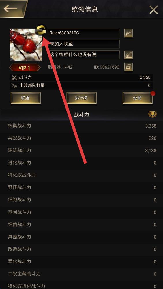 1、點擊屏幕上方顯示戰(zhàn)斗力數(shù)值的區(qū)域,進入統(tǒng)領信息界面。