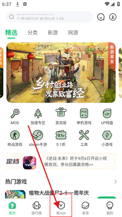 1、首先,你可以將軟件下載到手機桌面上,并點擊進入到平臺,點擊中間的【免root】,如下圖所示;