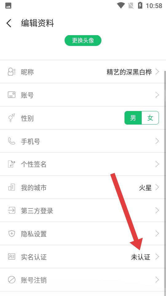 2、點擊編輯圖標按鈕后,進入編輯資料的頁面,找到實名認證選項并點擊。