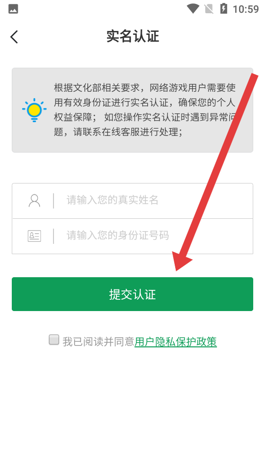 3、在實名認證頁面輸入真實姓名、身份證號碼,勾選我已閱讀并同意用戶隱私保護政策后,點擊提交認證按鈕完成實名認證。