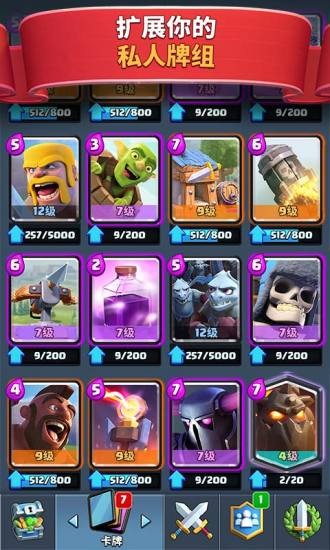 -- 收集皇室戰(zhàn)爭家族成員和您熟悉的《部落沖突》軍隊(duì),法術(shù)和防御建筑等卡牌,打造和升級(jí)您的卡組