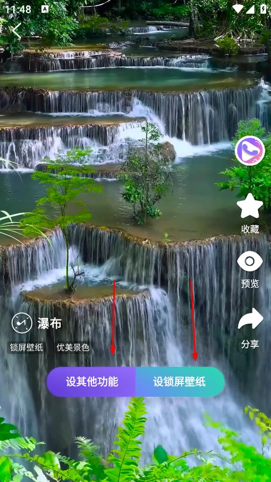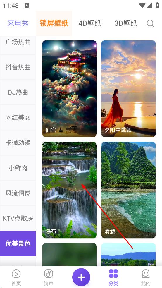 2、在分類里找到“優(yōu)美景色”類別,點(diǎn)擊進(jìn)入后瀏覽鎖屏壁紙,選中喜歡的“瀑布”壁紙,進(jìn)入詳情界面。