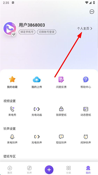 1、在視頻鈴聲來電秀首頁,點(diǎn)擊右下角我的按鈕,進(jìn)入個(gè)人中心界面。