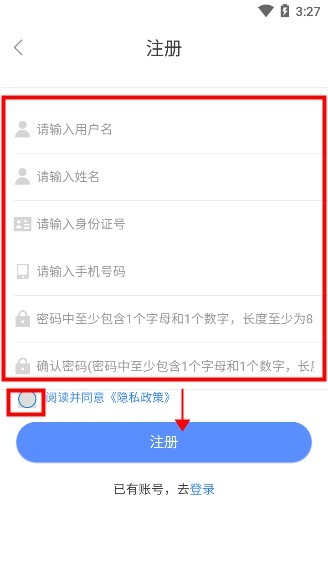 3、填寫(xiě)完畢注冊(cè)信息,點(diǎn)擊下方“注冊(cè)”按鈕;(請(qǐng)務(wù)必勾選“同意”隱私政策)