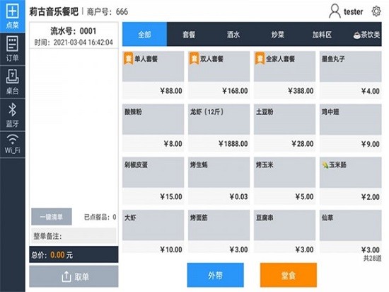按照分類展示了各種餐品,包括套餐、酒水、炒菜、加料區(qū)、茶飲類等分類;