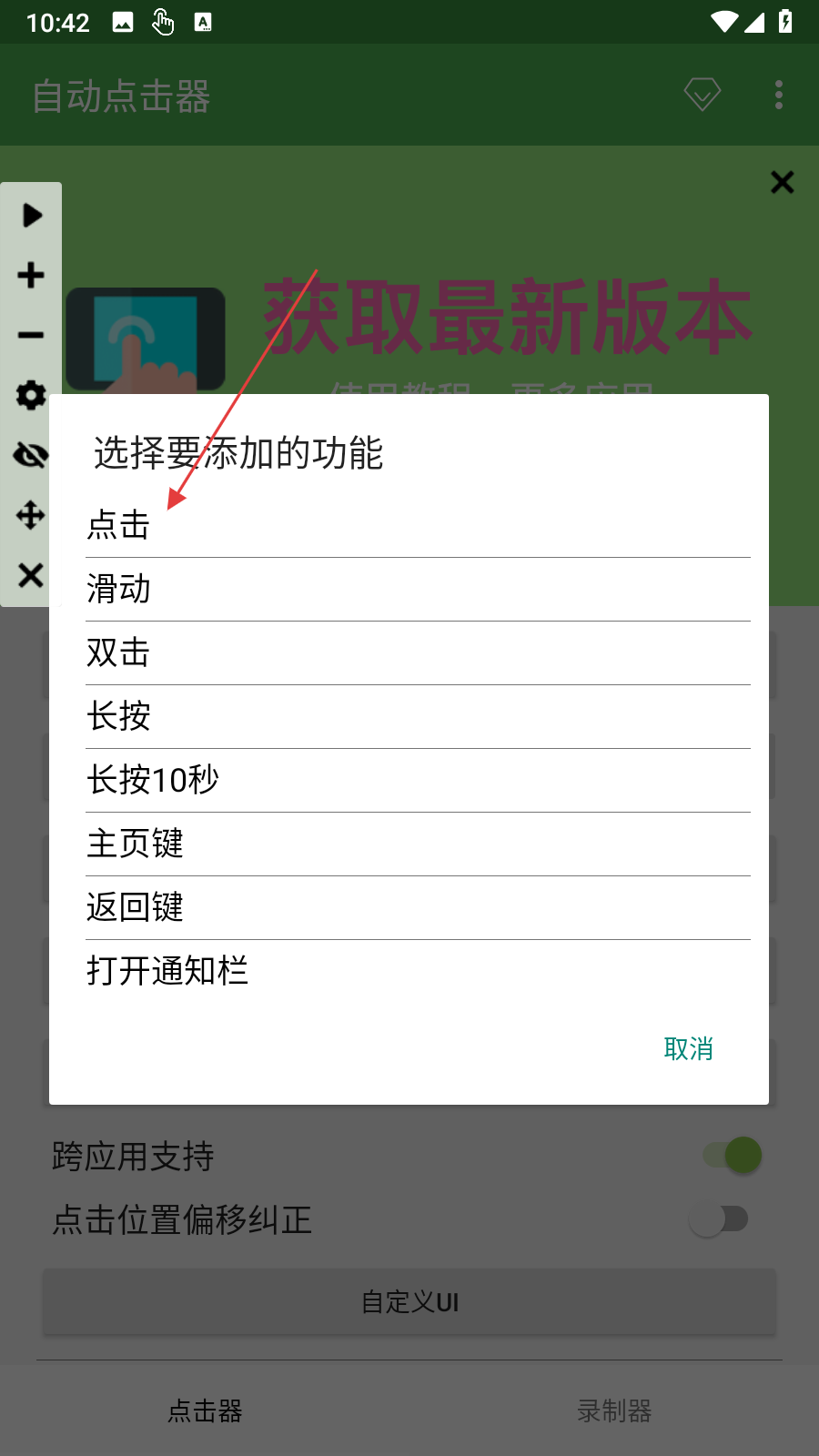 1、打開自動(dòng)點(diǎn)擊器,點(diǎn)擊左側(cè)懸浮窗的+號(hào),彈出選擇要添加的功能菜單。