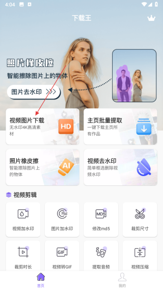 1、打開下載王APP,在主界面找到視頻圖片下載功能選項并點擊,進入提取內(nèi)容的操作頁面。