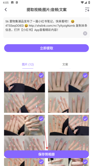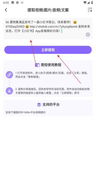 2、在抖音、小紅書等平臺找到要提取的內(nèi)容,點擊復制鏈接,將鏈接粘貼到輸入框,點擊立即提取。