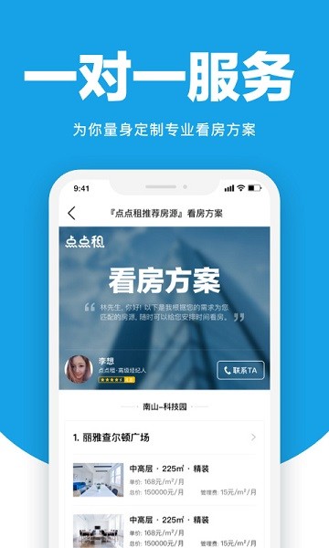 點(diǎn)點(diǎn)租對(duì)用戶全程不收取任何中介費(fèi)和服務(wù)費(fèi),節(jié)約用戶租辦公室成本。經(jīng)紀(jì)人1對(duì)1幫客戶匹配房源,帶用戶看房,用戶在點(diǎn)點(diǎn)租經(jīng)紀(jì)人的幫助下完成向業(yè)主議價(jià)、簽約、驗(yàn)收及后續(xù)流程。讓客戶安心放心更省心。
