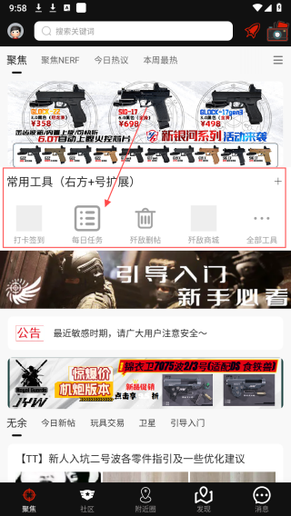 1、打開sdgun應(yīng)用進(jìn)入聚焦頁面,在常用工具區(qū)域,可點(diǎn)擊打卡簽到獲取相應(yīng)獎勵(lì),點(diǎn)擊每日任務(wù)查看并完成當(dāng)天任務(wù)來積累積分或獲取道具,點(diǎn)擊右方+號還能擴(kuò)展更多工具。