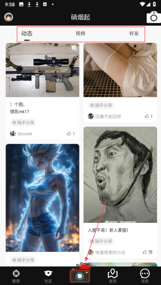 3、點(diǎn)擊底部導(dǎo)航欄的發(fā)現(xiàn)按鈕,可切換上方板塊查看各種內(nèi)容,點(diǎn)擊底部導(dǎo)航欄的相機(jī)圖標(biāo),可直接發(fā)布自己的動態(tài)、視頻,分享生活及對相關(guān)產(chǎn)品的見解。