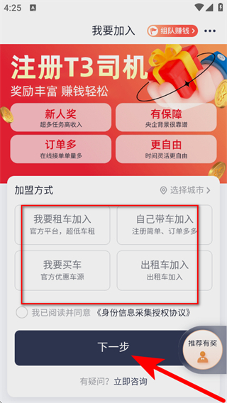 3、進(jìn)入注冊(cè)頁(yè)面后,選擇加盟方式自己帶車加入,勾選同意協(xié)議后點(diǎn)擊下一步。