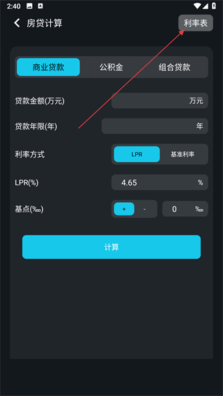 3、進(jìn)入房貸計(jì)算頁面后,點(diǎn)擊右上角的利率表。