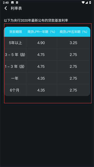 4、點(diǎn)擊之后進(jìn)入查看頁面,即可查看利率表。