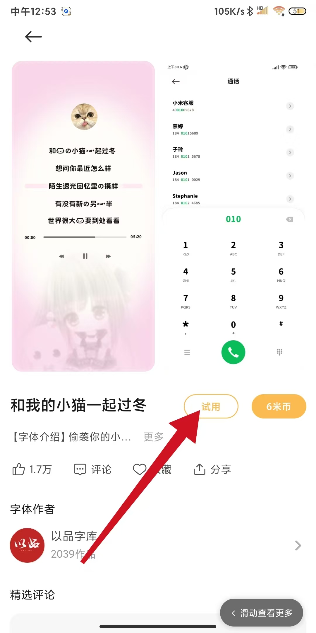 4、進入相應(yīng)風(fēng)格頁面后,瀏覽選擇喜歡的字體,點擊進入其詳情頁,再點擊試用按鈕,即可將該字體樣式應(yīng)用到miui桌面。