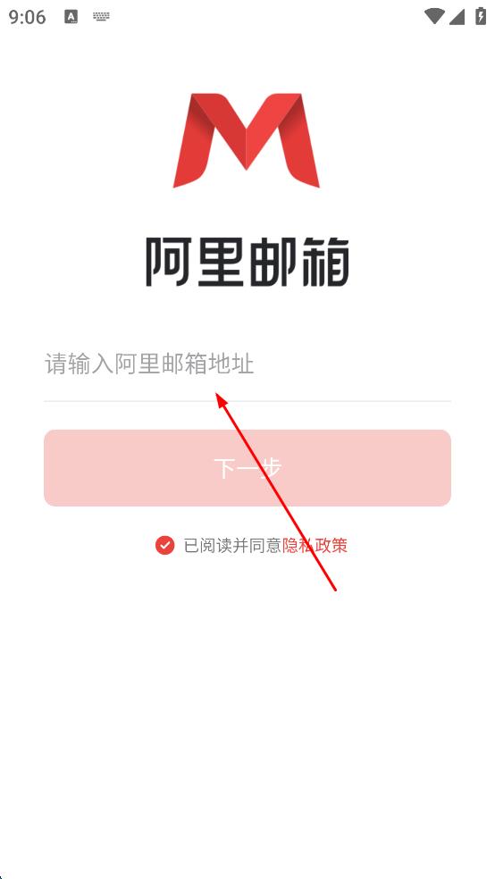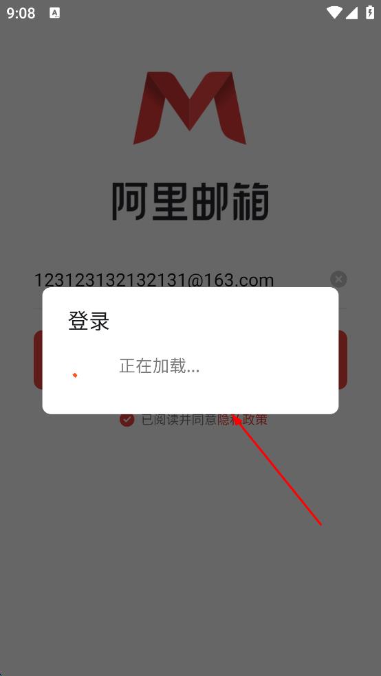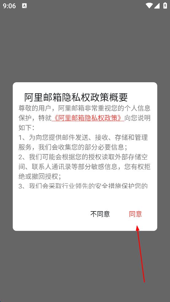 1、打開阿里郵箱應(yīng)用,會彈出阿里郵箱隱私權(quán)政策概要說明框,點擊“同意”,進入到登錄頁面。