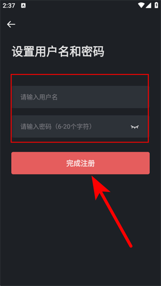 4、進入設(shè)置用戶名和密碼頁面,輸入用戶名和密碼,點擊完成注冊。