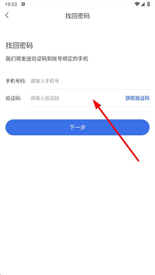 3、在找回密碼頁面,輸入手機(jī)號(hào)碼和驗(yàn)證碼,點(diǎn)擊下一步按鈕,按照提示完成密碼找回操作。