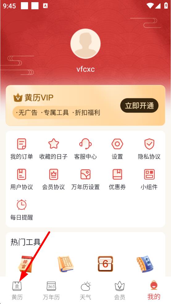 1、打開老黃歷應(yīng)用,進(jìn)入我的頁面,點(diǎn)擊下方黃歷按鈕進(jìn)入黃歷主界面。