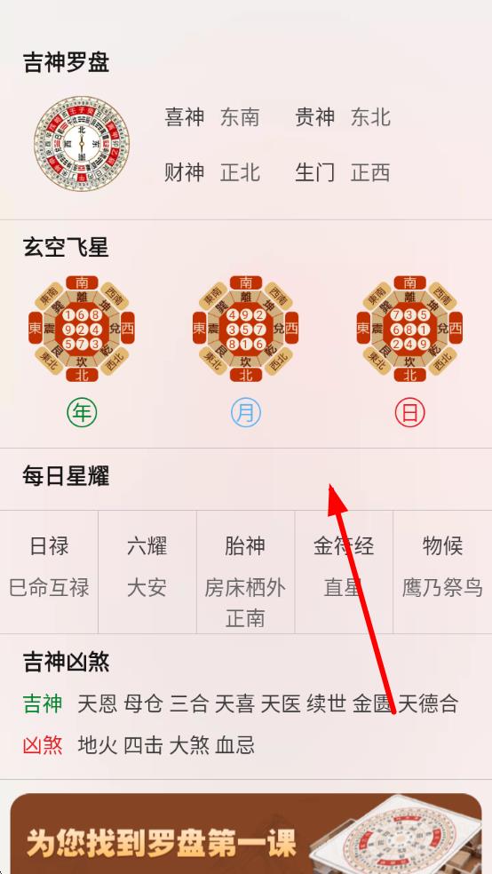 3、進(jìn)入詳情頁面后,可查看吉神羅盤、玄空飛星、每日星耀等詳細(xì)黃歷內(nèi)容。