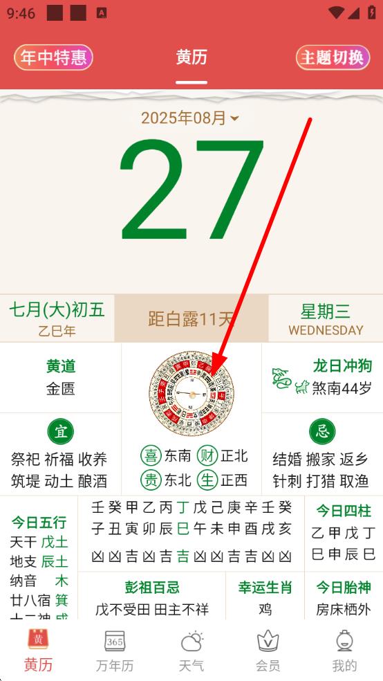 2、在黃歷主界面中,能看到當(dāng)日日期等基礎(chǔ)信息,點(diǎn)擊中間羅盤圖標(biāo)區(qū)域。