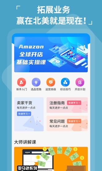 亞馬遜美國(guó)站app為需要開啟北美業(yè)務(wù)的電商用戶提供了一個(gè)可以學(xué)習(xí)美國(guó)站業(yè)務(wù)開辦的教學(xué)平臺(tái),軟件內(nèi)提供了多種教學(xué),可滿足用戶不同的培訓(xùn)需求,不管是開店技巧還是運(yùn)營(yíng)策略都可以在這里學(xué)習(xí)到相應(yīng)的內(nèi)容,詳情功能有需要的用戶不妨來(lái)下載了解更多吧!