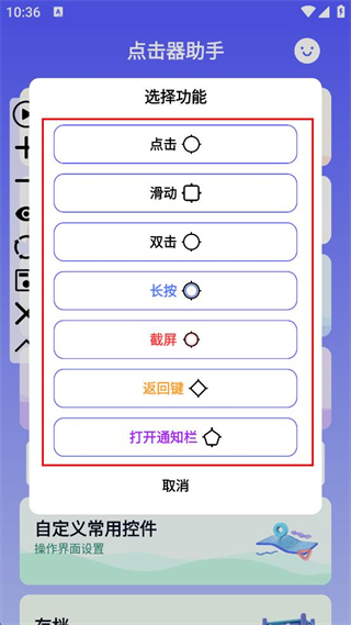 3、在選擇功能頁面,可選擇點擊、滑動、雙擊、長按、截屏、返回鍵、打開通知欄等功能。