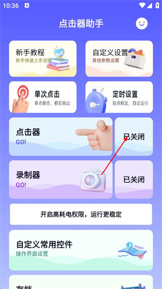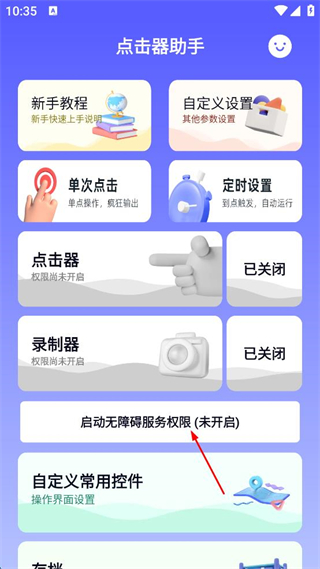1、打開點擊器助手,點擊啟動無障礙服務權(quán)限,開啟權(quán)限后點擊器和錄制器權(quán)限開啟。