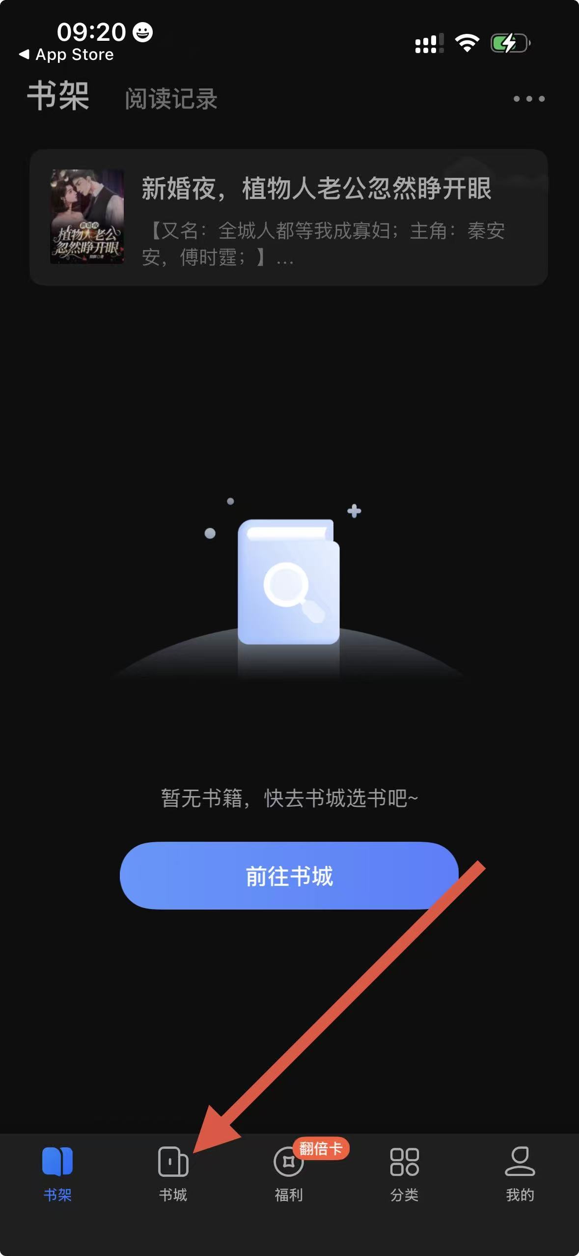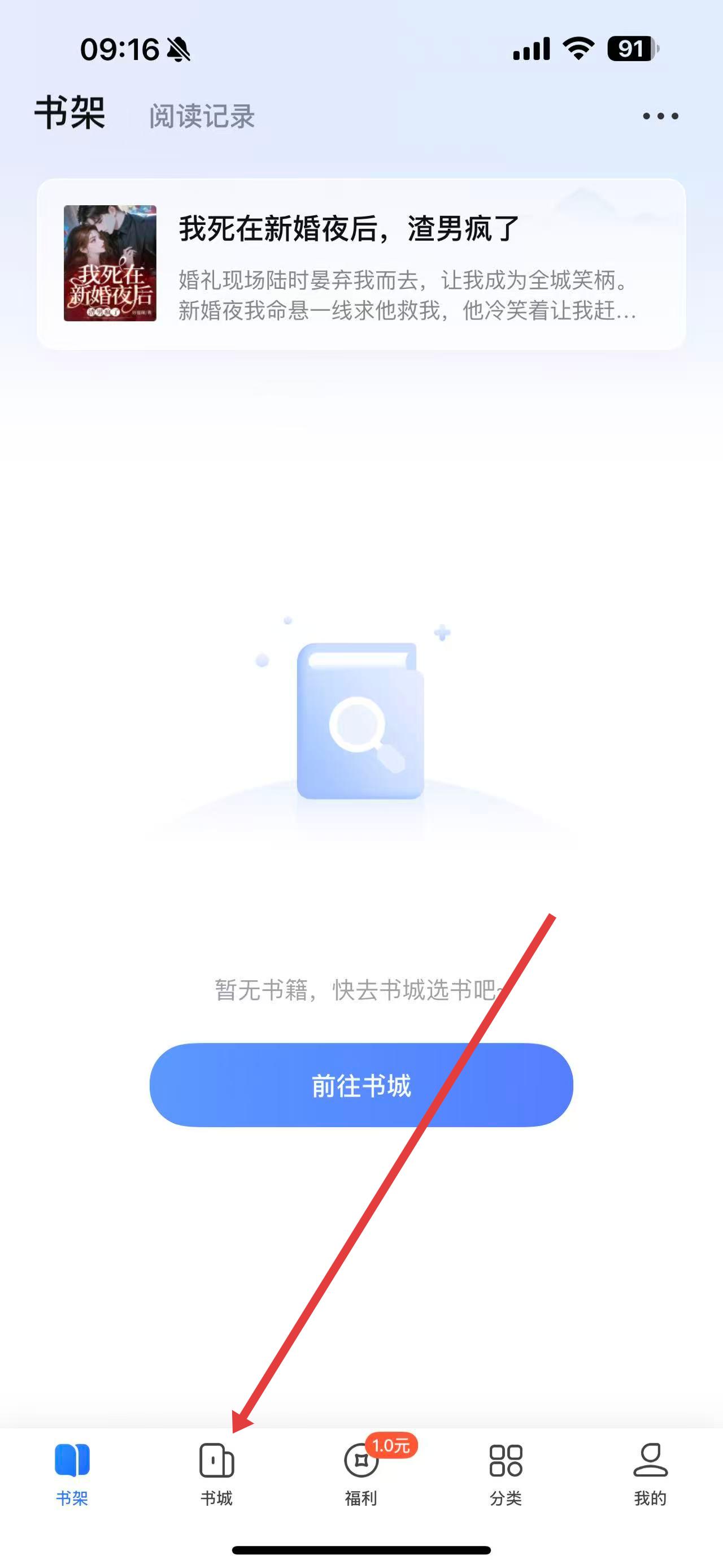 1、在江湖小說免費閱讀app書架頁面,點擊下方書城選項,進入書城界面。