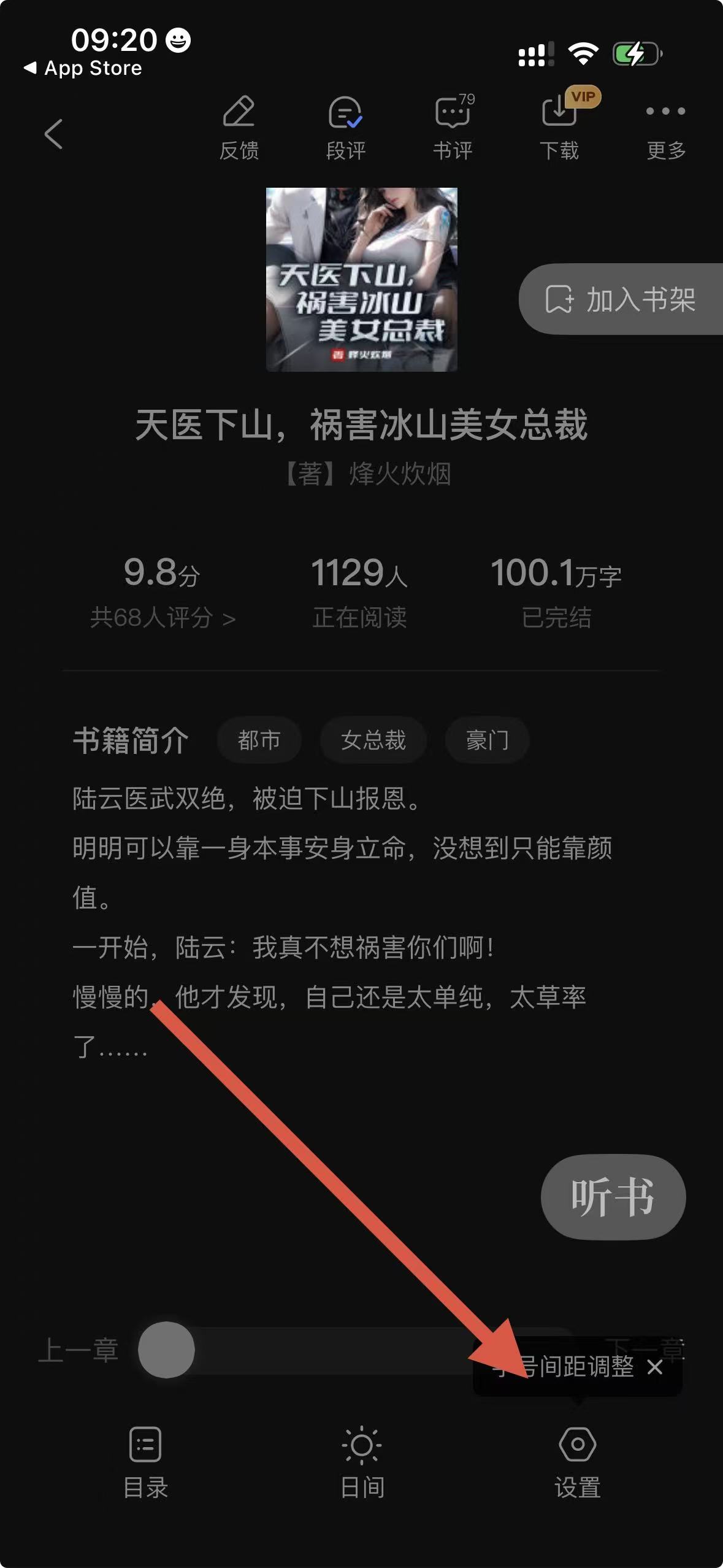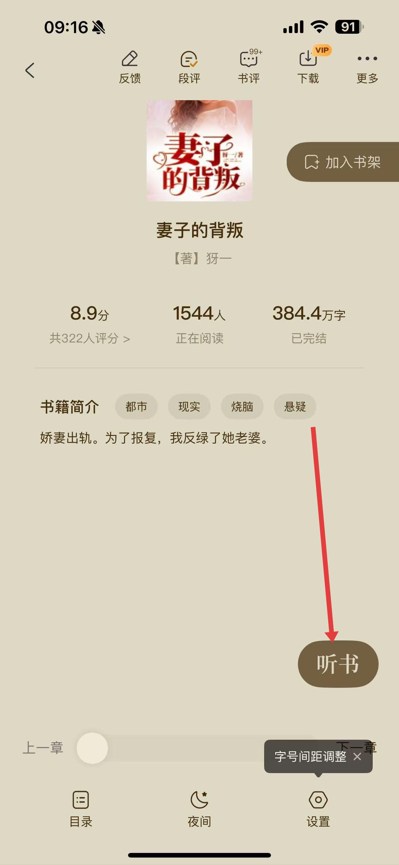 3、進入小說閱讀界面后,點擊屏幕上的聽書按鈕。
