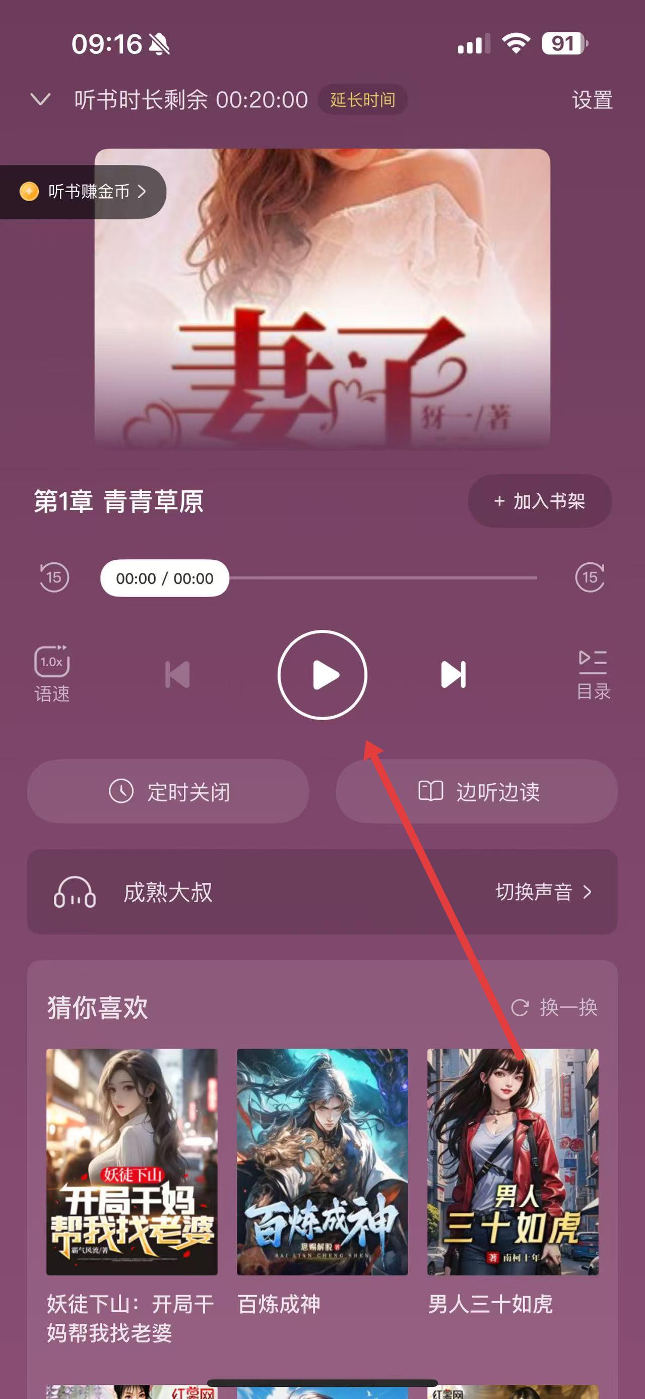 4、在聽書界面中,點擊播放按鈕即可開始收聽小說內(nèi)容。