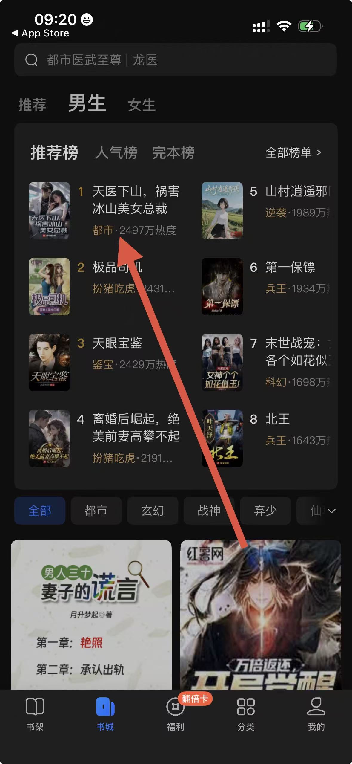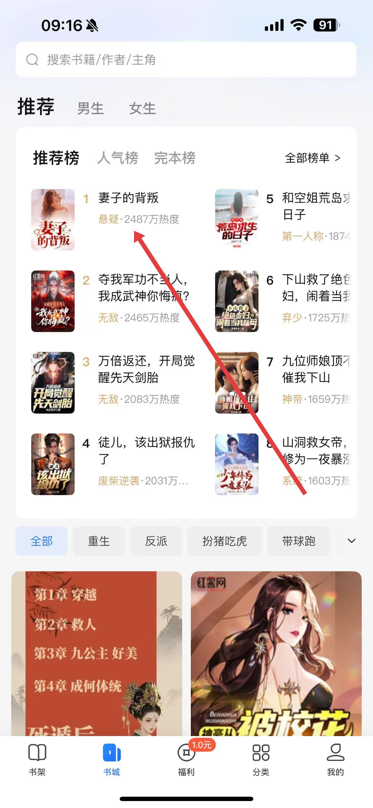 2、在書城的推薦榜單里,選擇一本感興趣的小說,比如妻子的背叛。