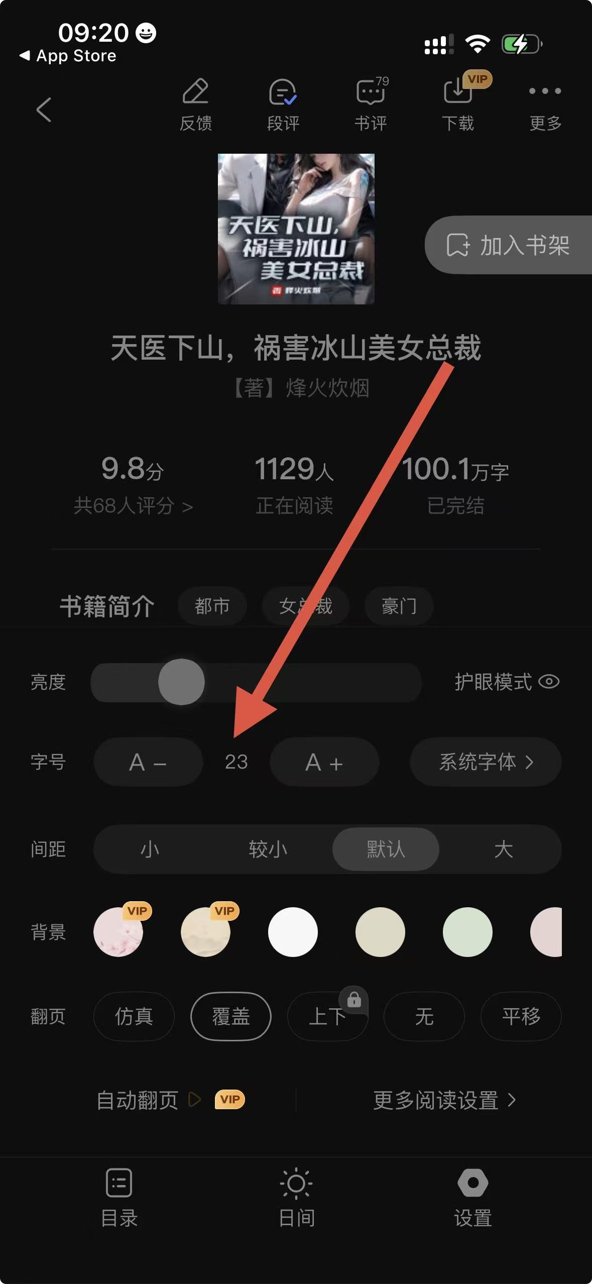 4、在閱讀設(shè)置界面,找到字號調(diào)整區(qū)域,點擊A+或A-按鈕,即可修改字體大小。