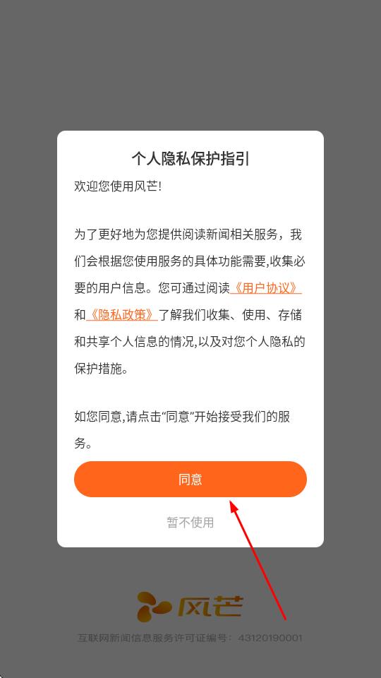 1、打開風(fēng)芒APP,在彈出的個人隱私保護(hù)指引彈窗中,點擊同意,進(jìn)入APP首頁。