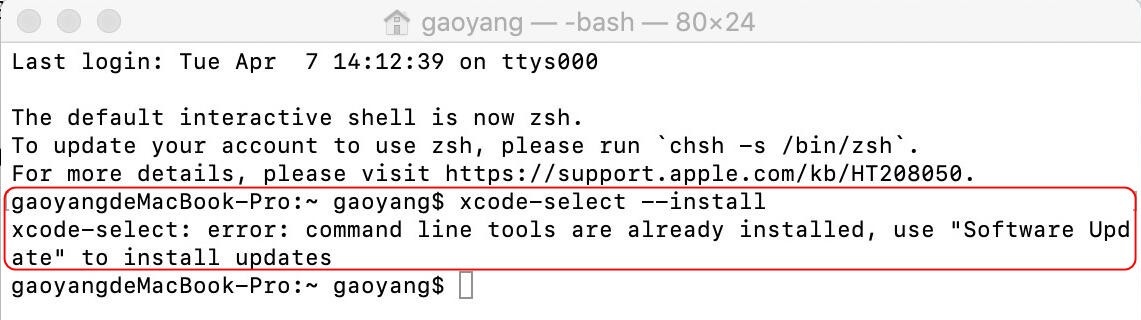 注意:如果 Mac 上已經安裝了命令行工具,終端會提示已安裝(如下圖所示),此時繼續(xù)執(zhí)行后續(xù)步驟即可。