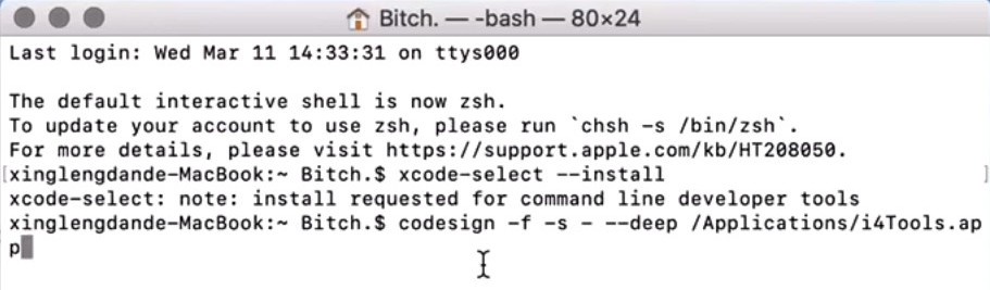 在終端上輸入:codesign -f -s - --deep /Applications/i4Tools.app(為避免出錯,建議直接復制此命令并粘貼到終端工具),輸入完成后按回車鍵,等待自簽命令執(zhí)行完成。