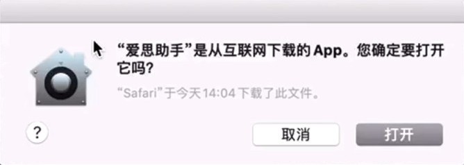 上述操作完成后,依次選擇“訪達 - 應用程序 - 愛思助手”右鍵打開,此時會彈出提示框,點擊“打開”即可。