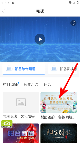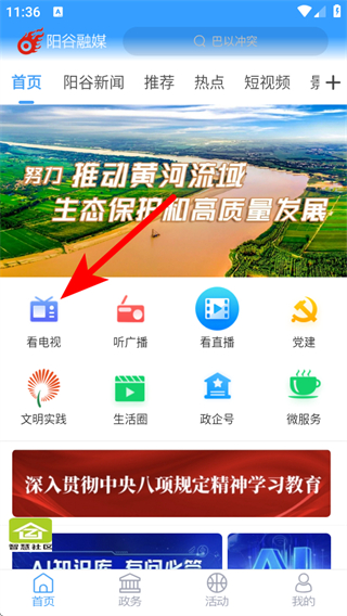 1、打開陽谷融媒APP首頁,點擊看電視按鈕,進入電視的板塊。