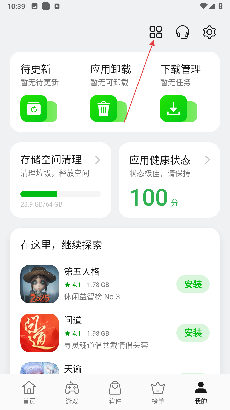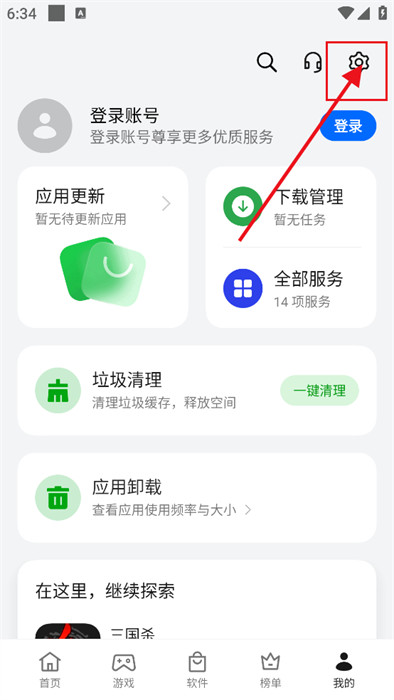 1、打開OPPO軟件商店進(jìn)入首頁,點擊右上角九宮格形狀的全部服務(wù)圖標(biāo),進(jìn)入全部服務(wù)頁面。