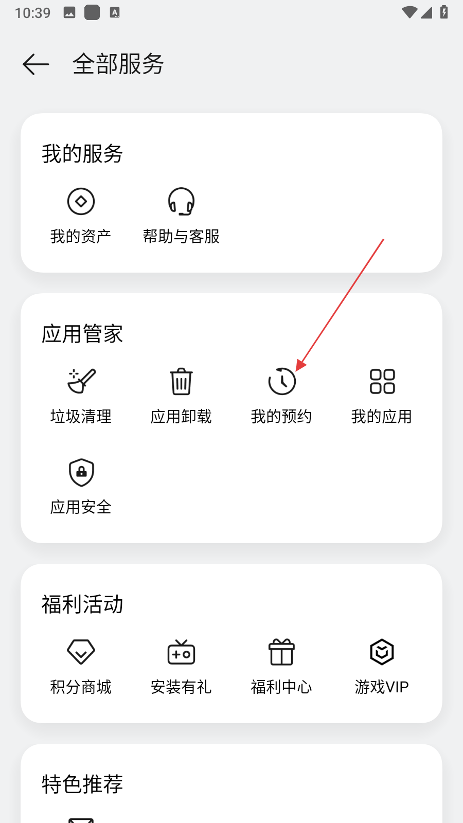 2、在全部服務(wù)頁面的應(yīng)用管家板塊中,點擊我的預(yù)約選項,進(jìn)入已預(yù)約的游戲列表頁面。