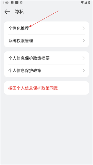 3、進(jìn)入隱私頁面之后,找到并點擊個性化推薦選項。